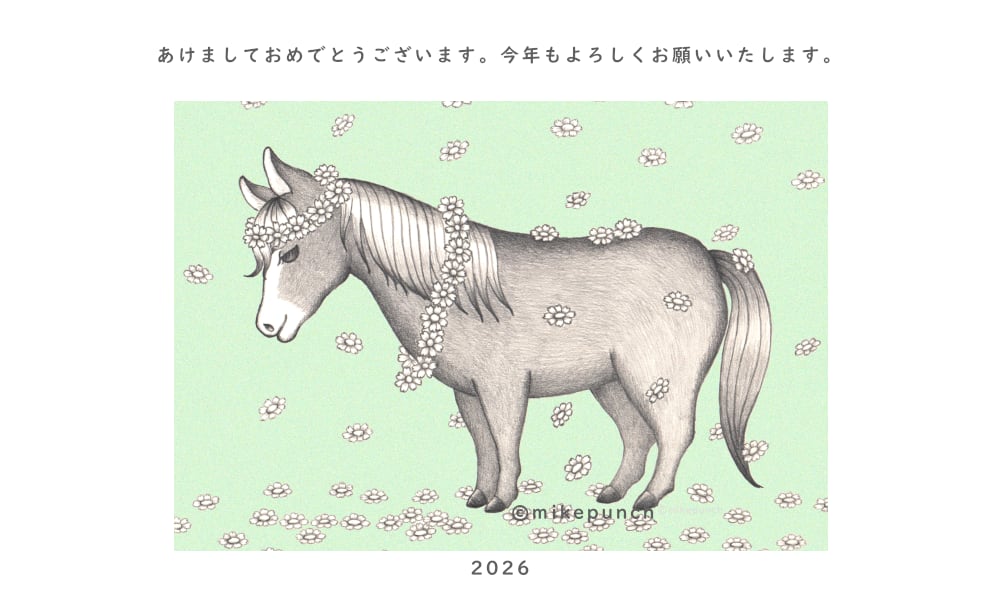 2026年の干支にちなんで ポニーを描いた鉛筆画をポストカードにしました。 やわらかな緑の光に満たされてたたずむポニー デイジーの花輪を首にかけ、デイジーの花が降りつもります。 デイジーの花言葉は「平和」 穏やかな静かな世界を描きました。 平和を愛する大切な方へのお便りに ご自身の日常に ポニーの絵をお使い頂けましたら幸いです。 同じ絵のキャンバスプリントもございます https://mikepunch.base.shop/items/125766444